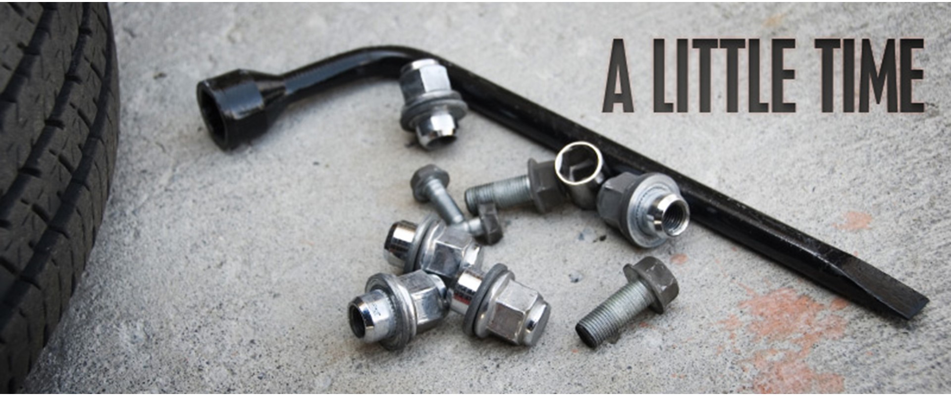 I figured right. I began to pull out all the necessary tools for the change and jacked up the car. As I got to the last lug bolt, it was an anti-theft bolt and needed a special lug remover. I went to grab it from where it should have been in a styrofoam container kept with the spare tire, but it wasn’t there. I took every tool there was in the container out and shook the container upside down…no lug remover.