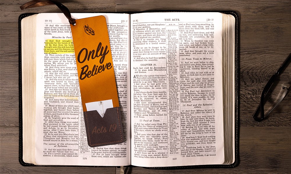 We manufactured these two bookmarks to securely hold your prayer cloth in Acts 19, so it will always be easy to find and ready to use. The bookmarks are made from thin leather, and a safety pin is included so you can pin it to your garment as the prophet instructed.
