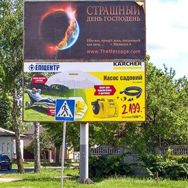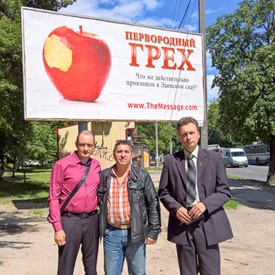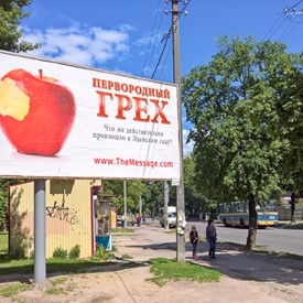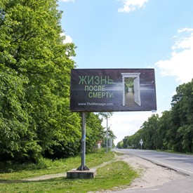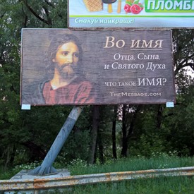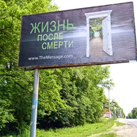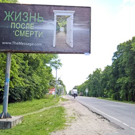 Just before Chernihiv, we saw by the side of the highway the first one of the four big advertisement boards. It was “In the Name.” In Chernihiv we met pastor Dima and he took us around to see those three other advertisement boards which were Life After, Original Sin, and The Dreadful Day Of The Lord. They were placed along the main highways which were leading to the city.