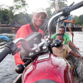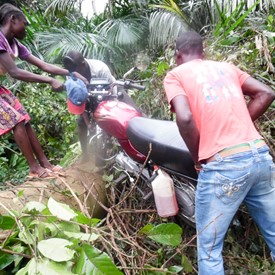 On Friday at 4:33 AM, our missionary, Brother Jean Itoko and myself left Mbandaka by motorcycle, on our way to Bolomba, located 301 km (187 miles) away. The purpose was to visit some of our libraries in that remote area, and to hold a meeting with the ministers and pastors of the area in order to establish the VGR librarian in Bolomba.