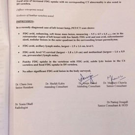 This testimony is about my mother who was diagnosed with metastatic breast cancer. The first PET scan test in January 2017 showed black dots all over the body in the scan. The cancer had spread to lymph nodes in the chest and vertebra bones at the back.