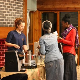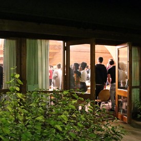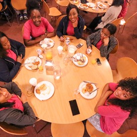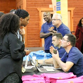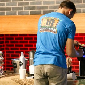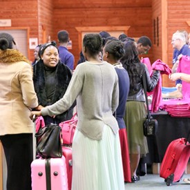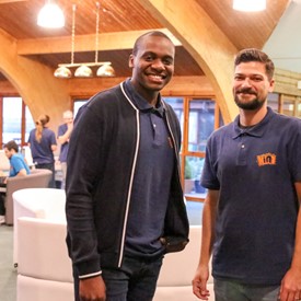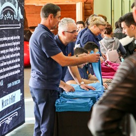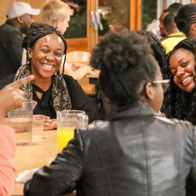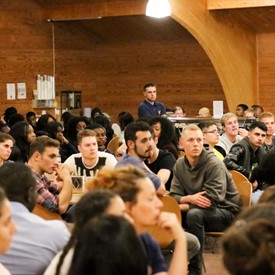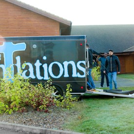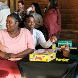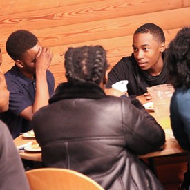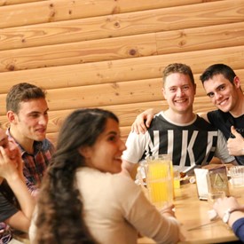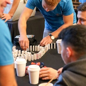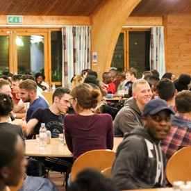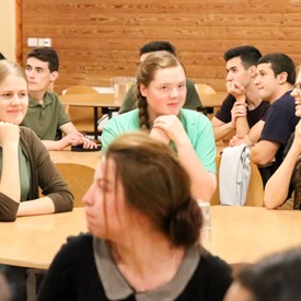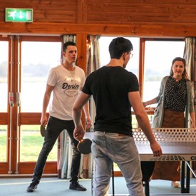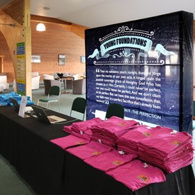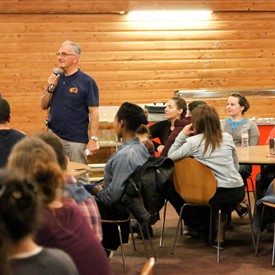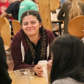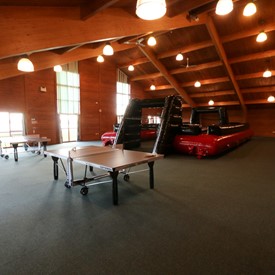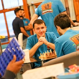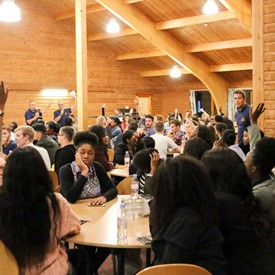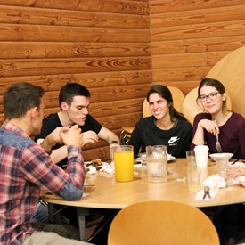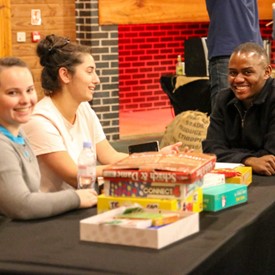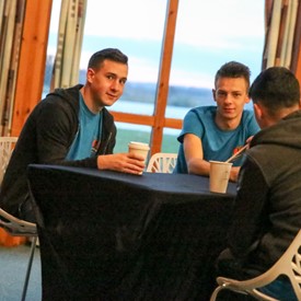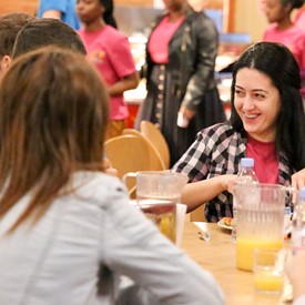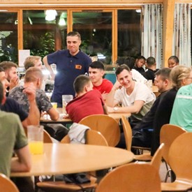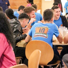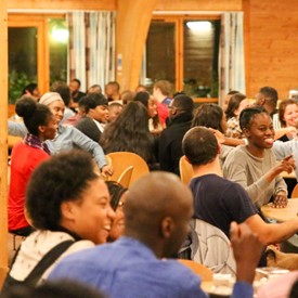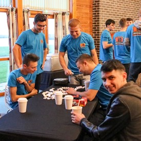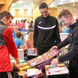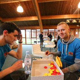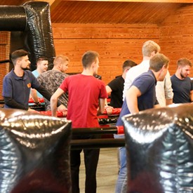 On Saturday morning, a hot cup of coffee topped off with whipped cream lured the youth from their rooms before an appetizing American breakfast. Afterwards, youth enjoyed human-foosball, ping-pong, foosball, cornhole, "Nine Square in the Air", volleyball, and various table games. Others simply enjoyed some much-needed fellowship around the Word. The day was filled with non-stop entertainment until it was time for everybody to get ready for the evening banquet.