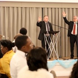 Such an anointing was present while the worship continued after the tape. A young staff member of the banquet facility, a Sikh from India said, "It's a good atmosphere in here, you've created a good atmosphere in here. They all look really happy."